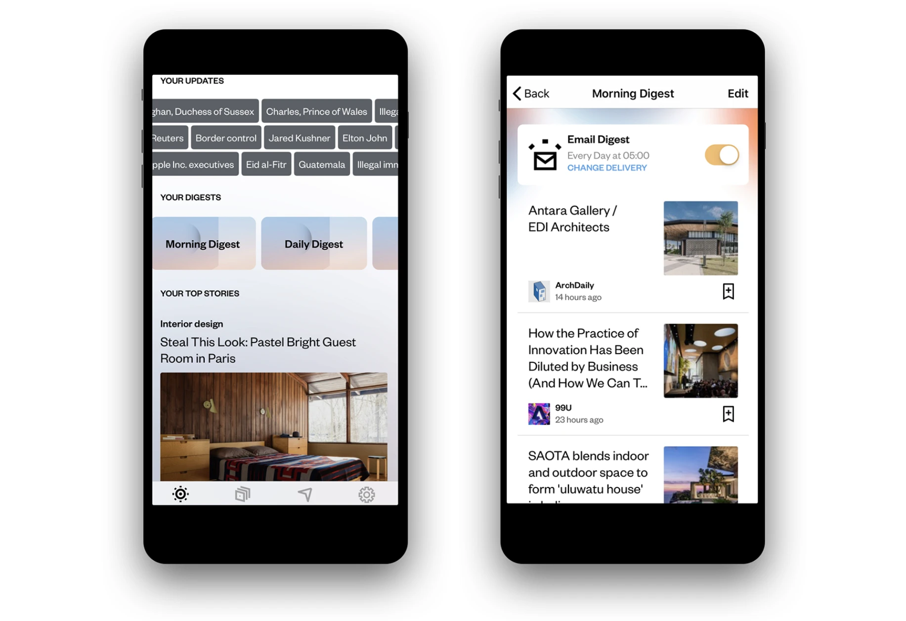 People wanted news routines that fit their day. I designed a digest builder: choose your channels, set the time (morning, lunch, evening), optionally deliver it to your inbox as a newsletter. Full control over what, when, and how.